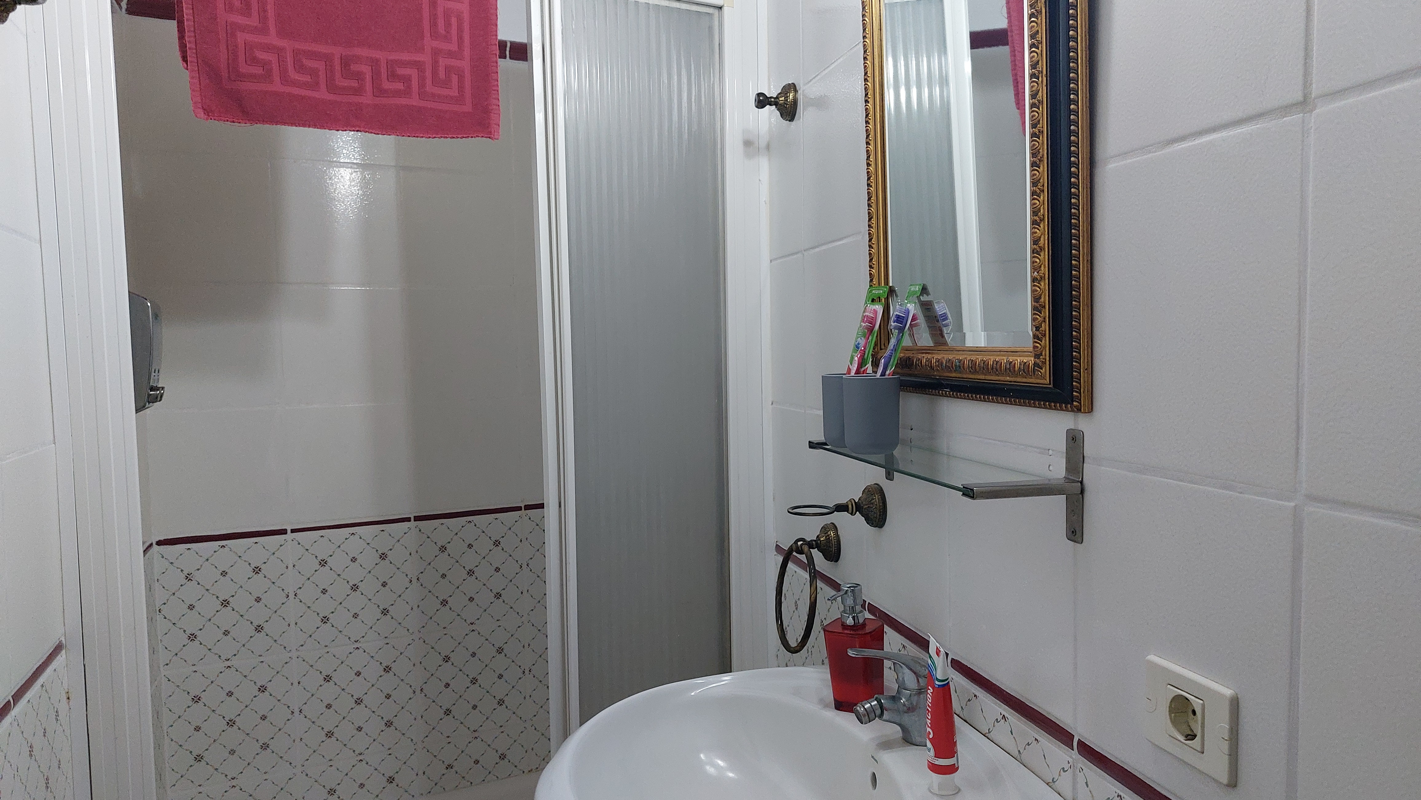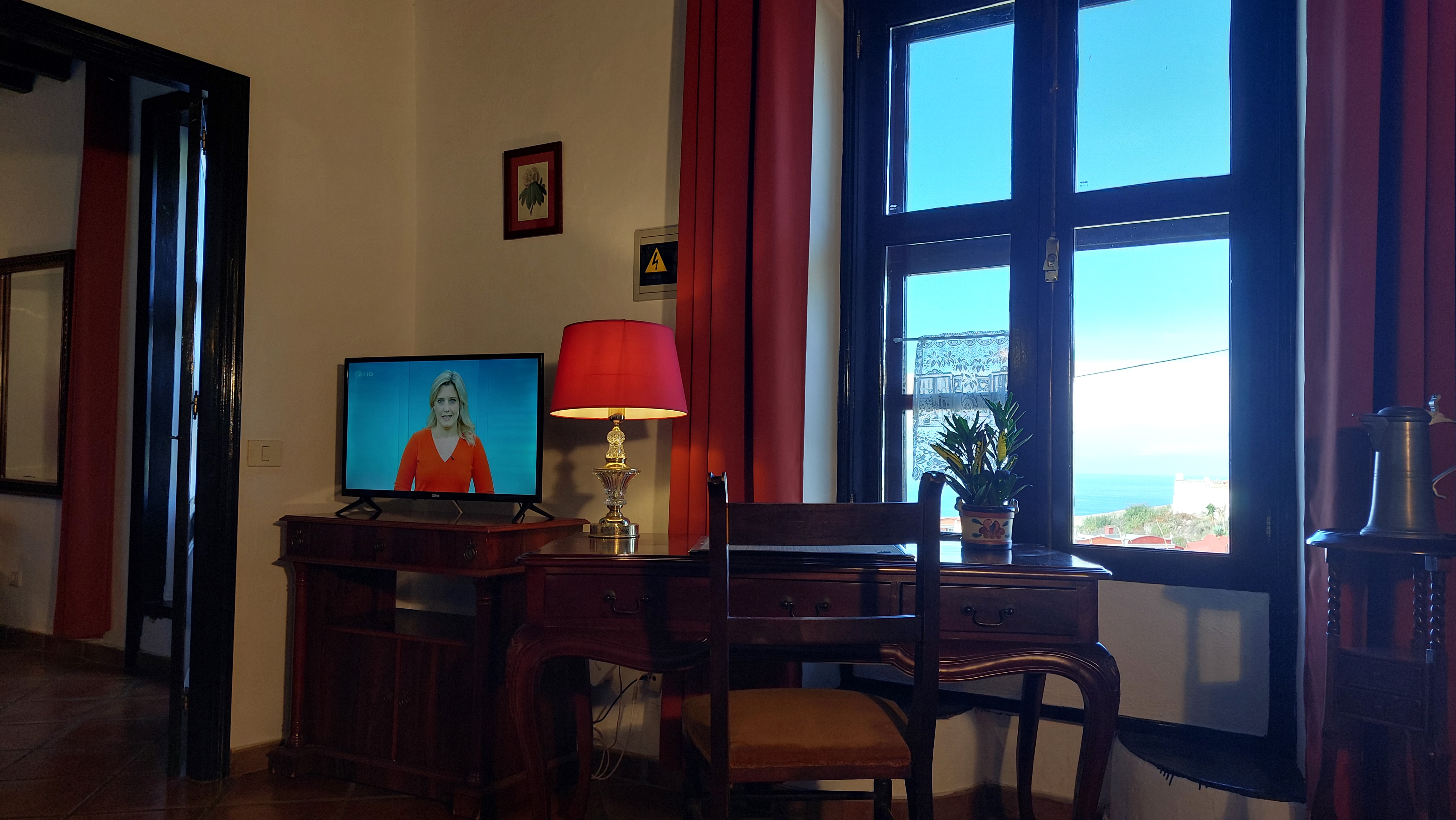 This English-style holiday home with sea views is on the first floor facing the country road (triple glazing). It has a bedroom, a living area with kitchenette, dining area, desk and sitting area and a bathroom with shower. The large communal roof terrace can of course be used for being outdoors. The flat screen TV has satellite reception with around 450 international channels - including BBC World News and CNN - as well as antenna reception with the usual Spanish TV channels by switching on the remote control, most of which can be switched to the original language (which mostly is English).