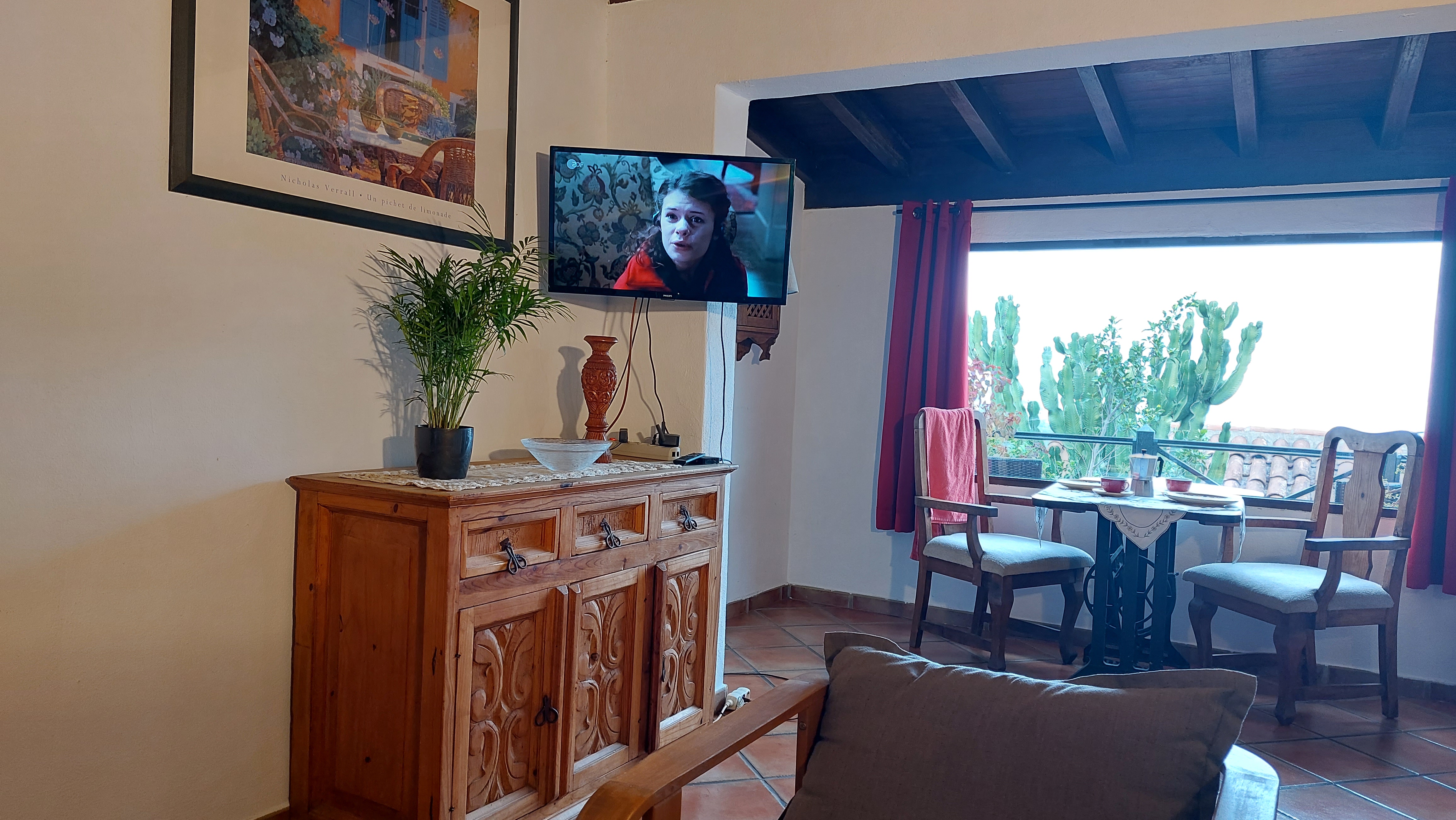 This holiday home is located on the first floor of our house and is furnished in a rustic Mexican style. All windows face the inner courtyard. The apartment has a private balcony with sea views. The living area is divided into a dining area directly at the window to the balcony, a kitchenette and the actual living area with a sofa and two armchairs. The bathroom with shower is entered from the bedroom. The flat screen TV has satellite reception with around 450 international channels - including BBC World and CNN - as well as local reception with common Spanish TV channels by switching on the remote control (international movies on most of the Spanish TV channels can be switched to the original language). Of course, the large communal roof terrace can also be used.